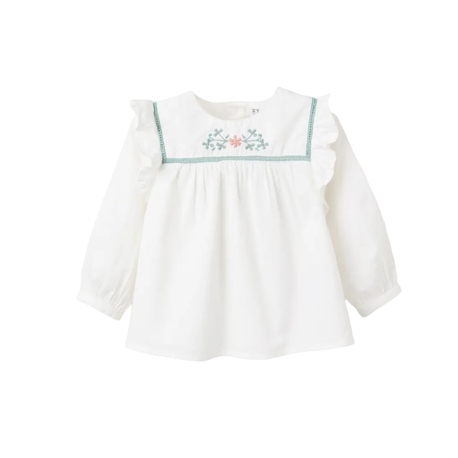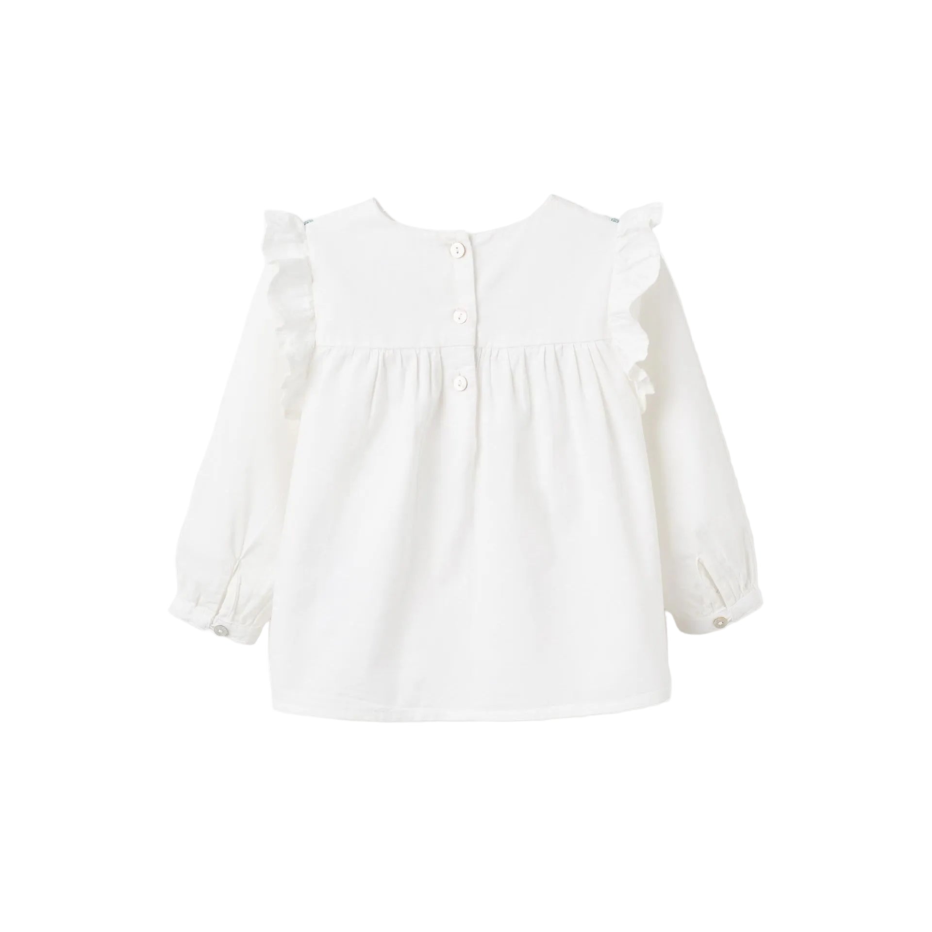 Esta blusa de popelín para niña, ideal para la temporada primavera-verano. Su tejido ligero y transpirable proporciona comodidad durante todo el día. La blusa cuenta con mangas anchas s y un delicado fruncido en el pecho, junto con un bordado delicado que añade un toque de estilo