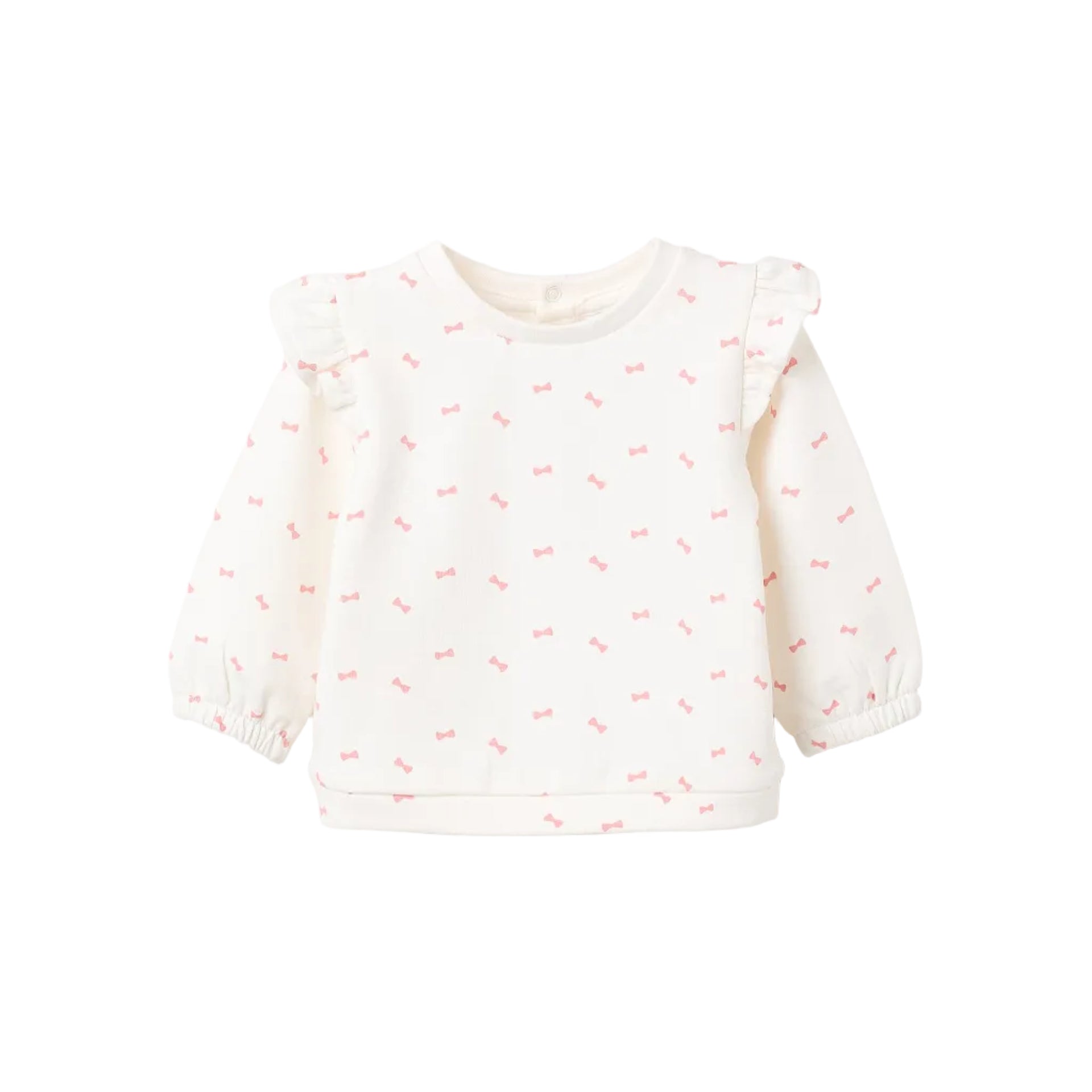 Buzo en algodón con cuello en color ivory con detalle de lazos rosas, perfecto para cualquier outfit.