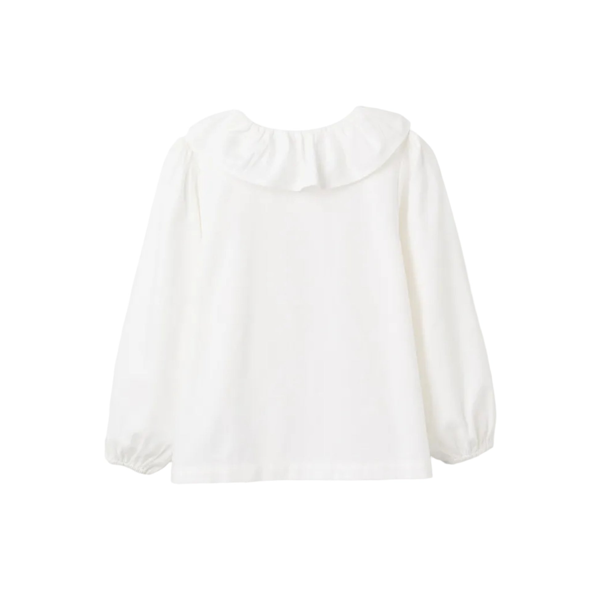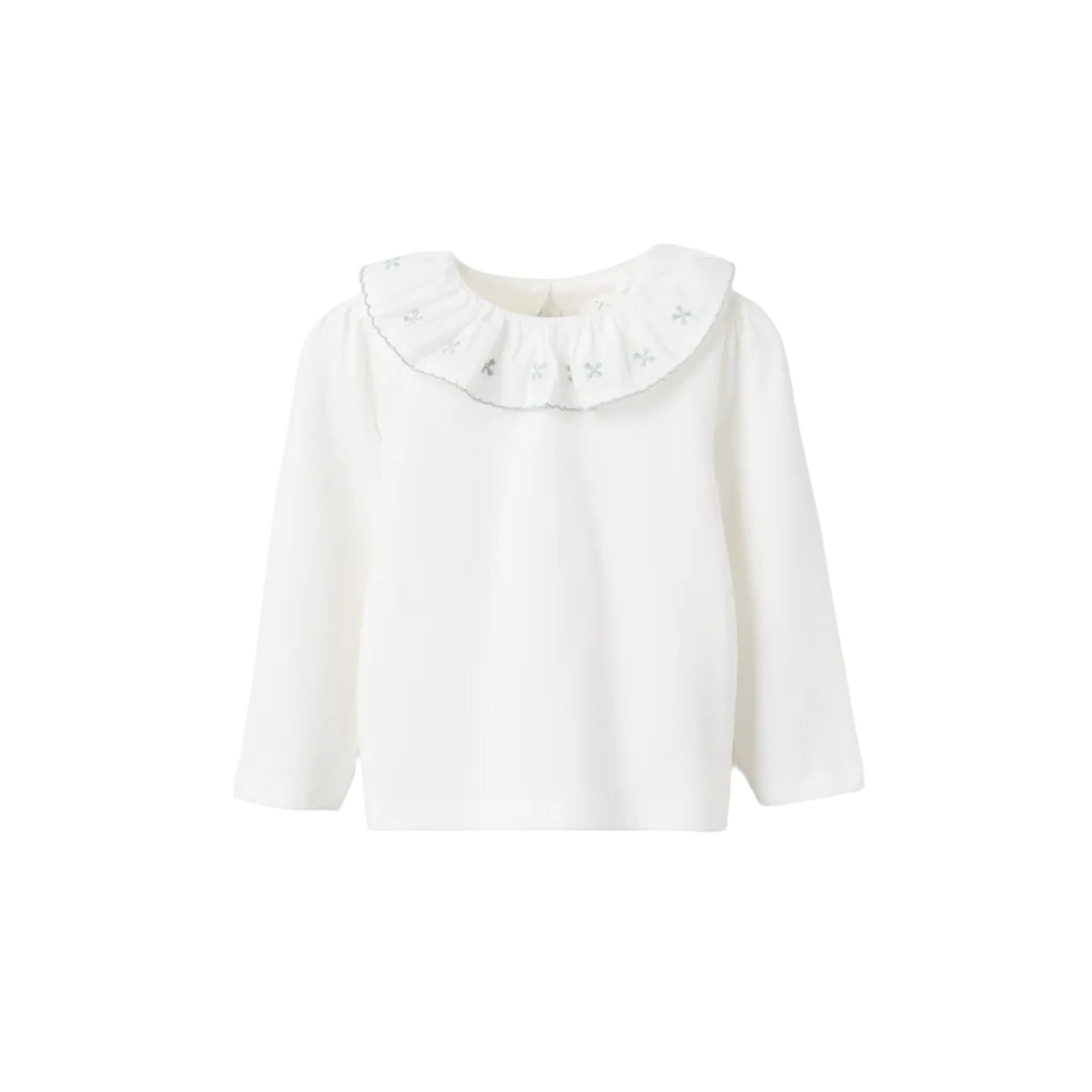 Esta es una camiseta para niña, perfecta para los meses de otoño e invierno. Su tejido de punto la hace cómoda y suave al tacto. La camiseta es de color blanco, con un diseño con flores en el cuello que la hace fácil de combinar. Esta prenda esencial en el armario de tu niña, es ideal para el día a día, proporcionando confort y estilo en una sola pieza.