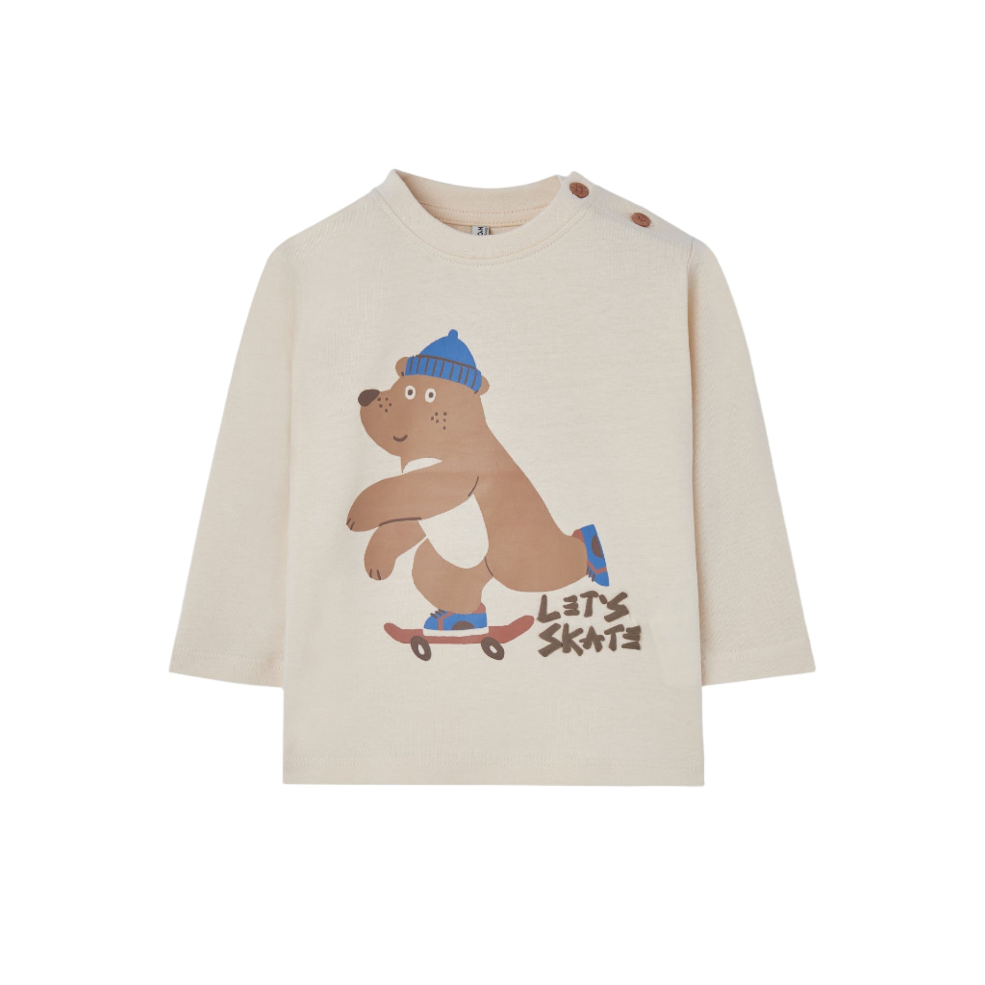 Esta es una camiseta en algodón diseñada para niño, perfecta para el uso diario. Está fabricada en un material suave y transpirable que proporciona comodidad durante todo el día. La camiseta es de color ivory y presenta un hermoso detalle de osito en skate que le da un toque divertido y tierno, ideal para combinar con el Pantalon Fleece Losan Monopatín Beige