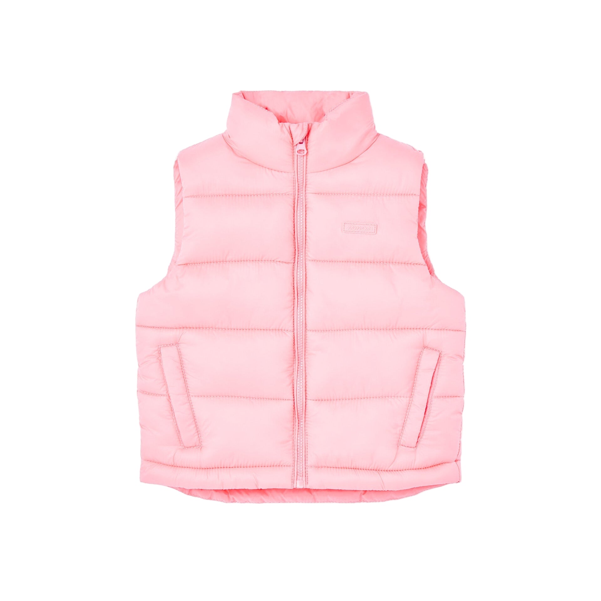 Chaleco en tono rosa acolchado liviano con dos bolsillos laterales con cierre de cremallera.