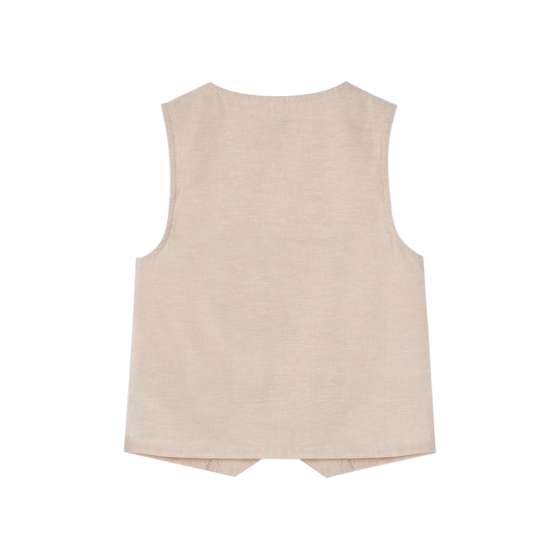 Este es un chaleco de lino en un hermoso tono beige, ideal para una fiesta en climas cálidos. El chaleco tiene un cuello en V y un tejido plano, que proporciona un ajuste cómodo para el niño. El color agrega un toque de estilo fresco. El chaleco también tiene cierre de botón para vestirse fácilmente. Este chaleco es una prenda cómoda y versátil para cualquier ocasión o evento al que asistas durante los meses más calurosos. Sin duda, una prenda que combina funcionalidad y estilo en la moda infantil.