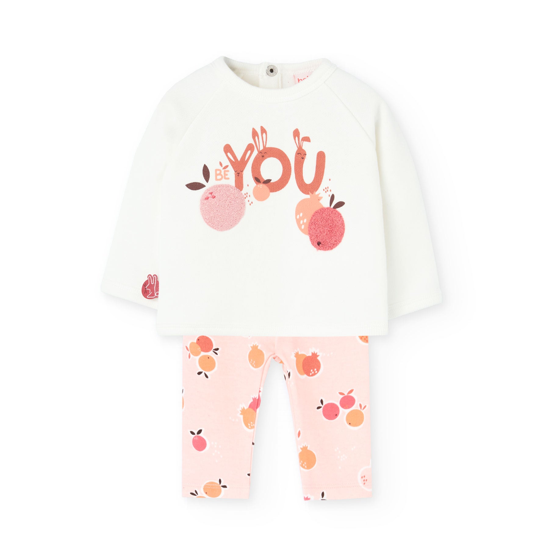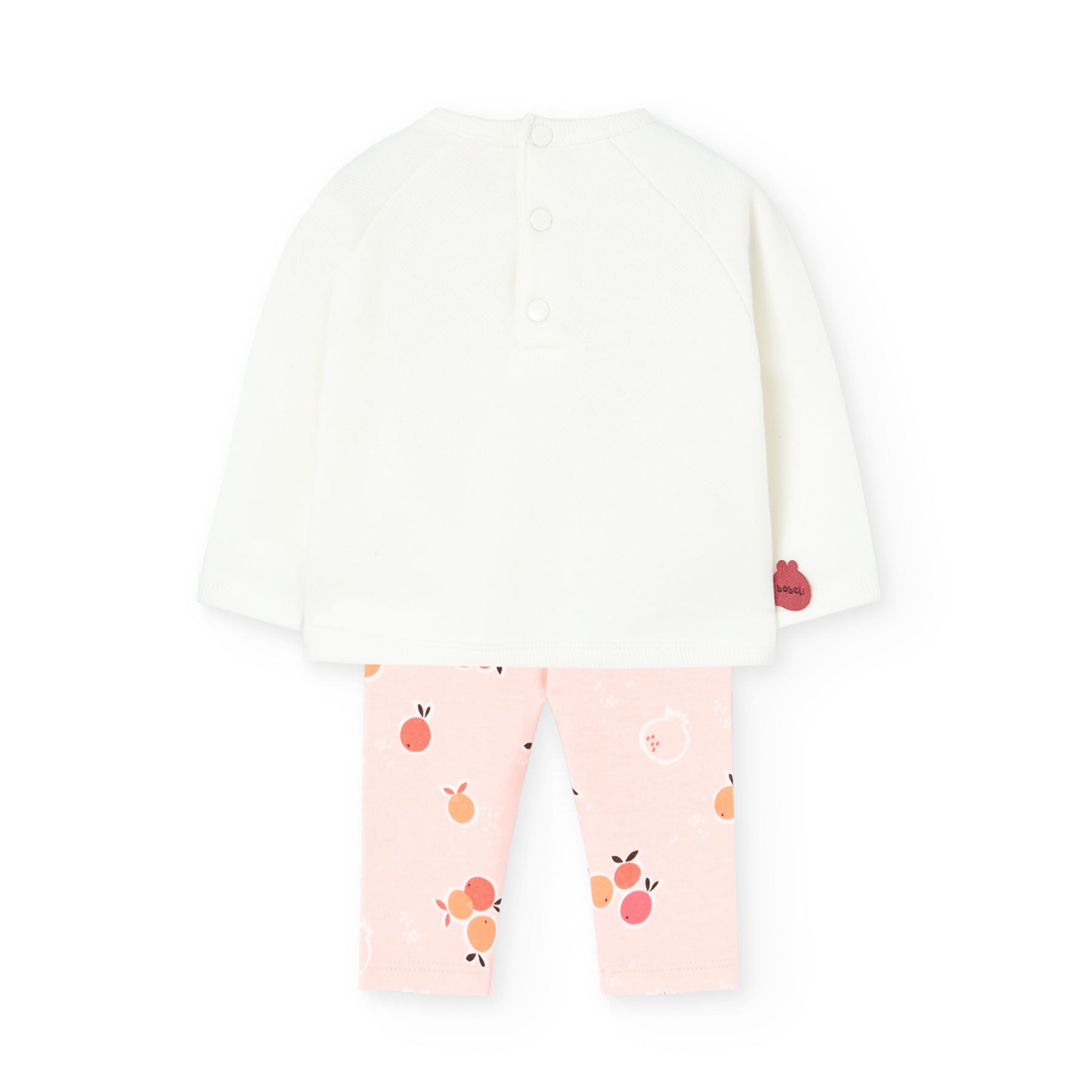 Este conjunto para bebé incluye un buzo en algodón y pantalones en material liviano y suave. El buzo, está hecho de algodón, luce un estampado de frutas en paleta de colores rosaceo y se cierra fácilmente con botones en la parte trasera.