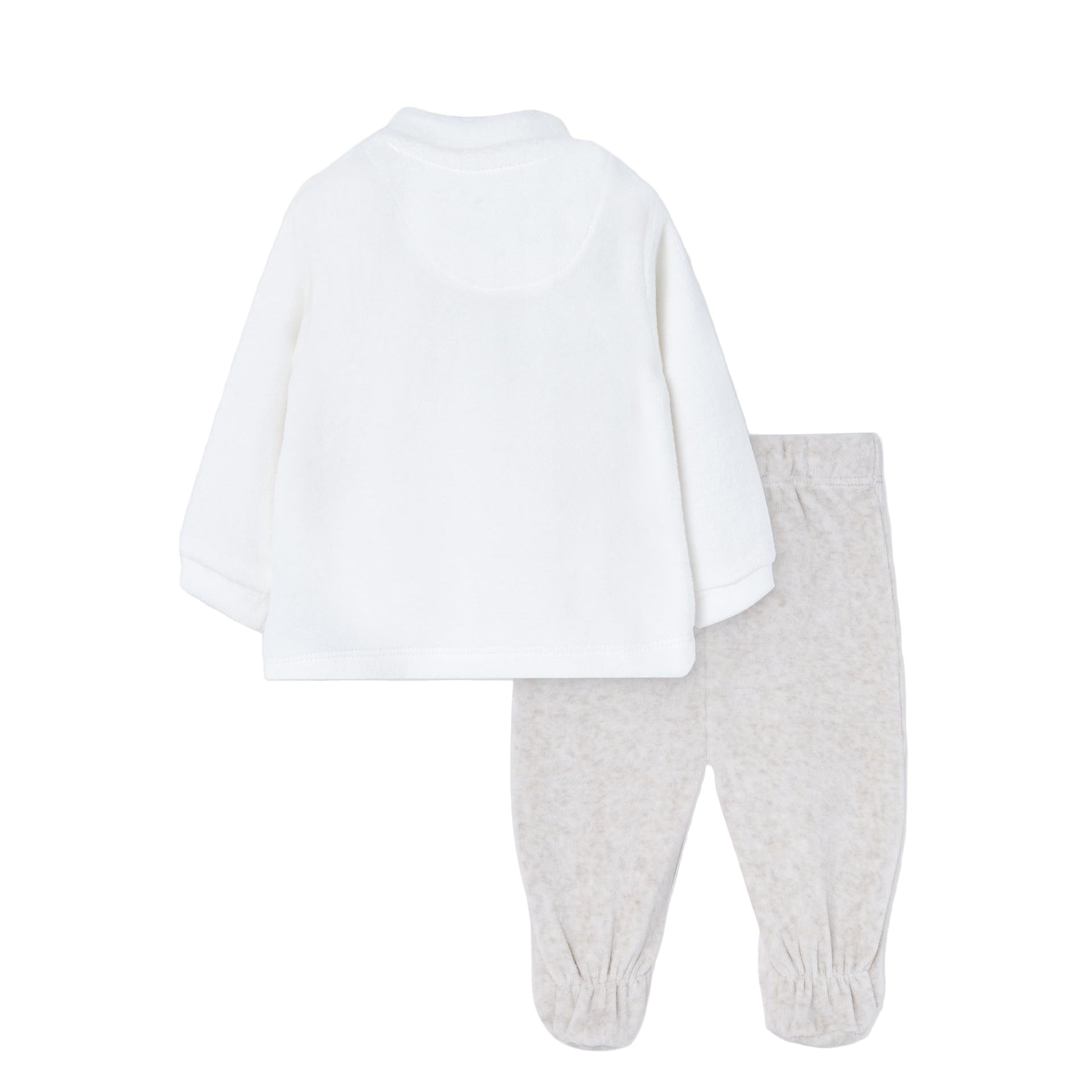 Este es un conjunto para bebé ideal para recién nacidos. El diseño incluye un estampado delicado que aporta un toque de ternura. El cuello redondo y las mangas largas proporcionan comodidad y protección en los días de invierno. El tejido de punto es suave y cálido, perfecto para la delicada piel de los bebés. El cierre de botón facilita el cambio de ropa. El color blanco aporta un aspecto limpio y fresco. Este conjunto es una opción excelente para mantener a tu pequeña abrigada y con estilo.