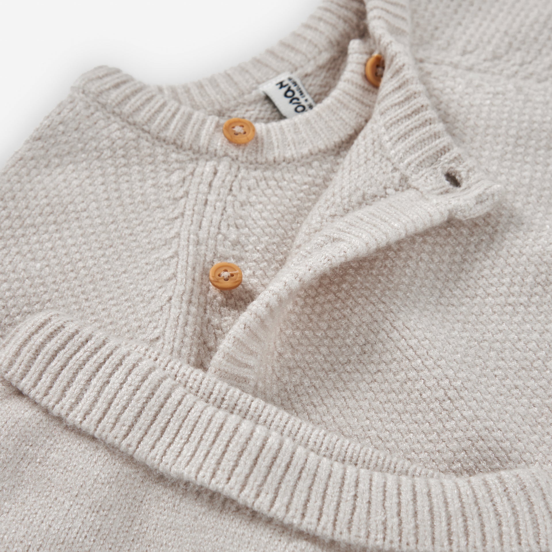 Este es un conjunto en algodón para bebé. Su diseño cuello redondo le dan un toque clásico y elegante. Las mangas largas son perfectas para mantener al pequeño abrigado. El tejido de punto es suave y cómodo, ideal para la delicada piel del bebé. El cierre de botón en la parte trasera facilita el vestir y desvestir al niño. El color crudo vigoré es versátil y fácil de combinar con otras prendas.