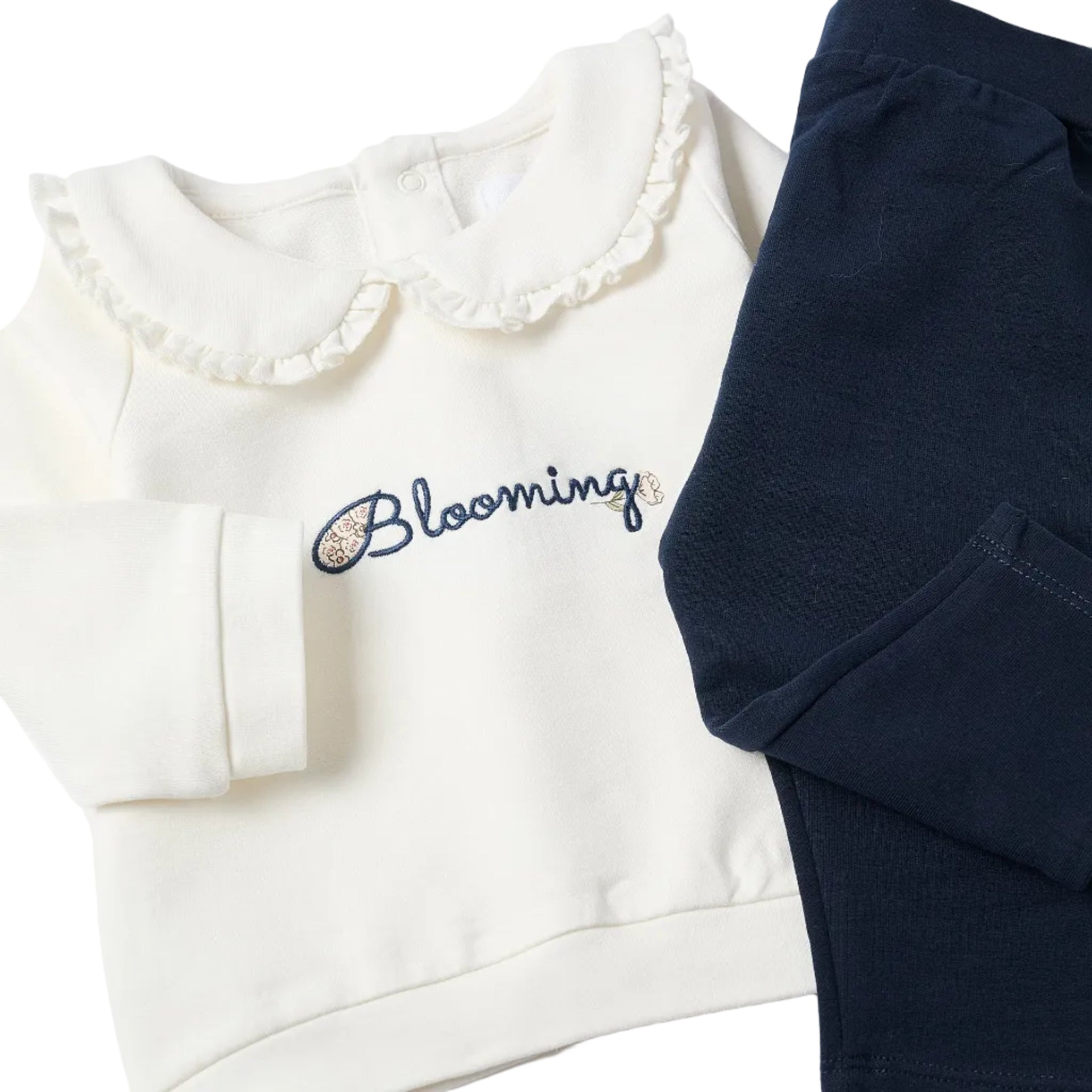 Este es un conjunto en algodón para bebé en color azul e Ivory, acompañado de pantalones en tono azul oscuro.