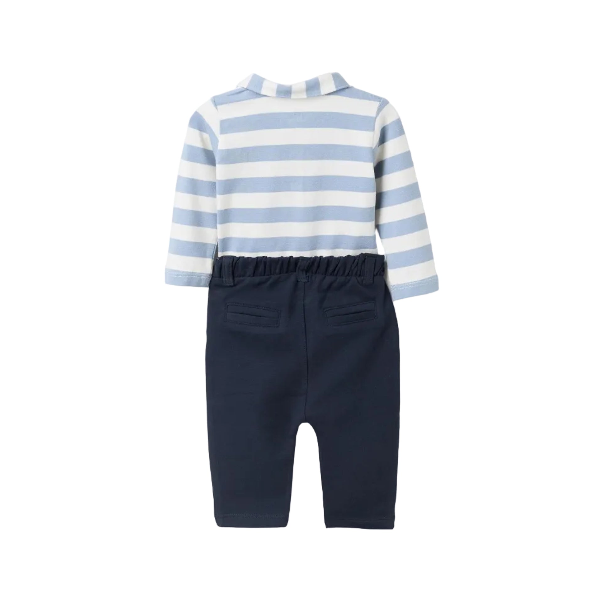 Este es un conjunto en algodón para bebé en color azul e Ivory, acompañado de pantalones en tono azul oscuro. La camiseta presenta un divertido diseño de rayas atemporal, lo que la hace atractiva y alegre.