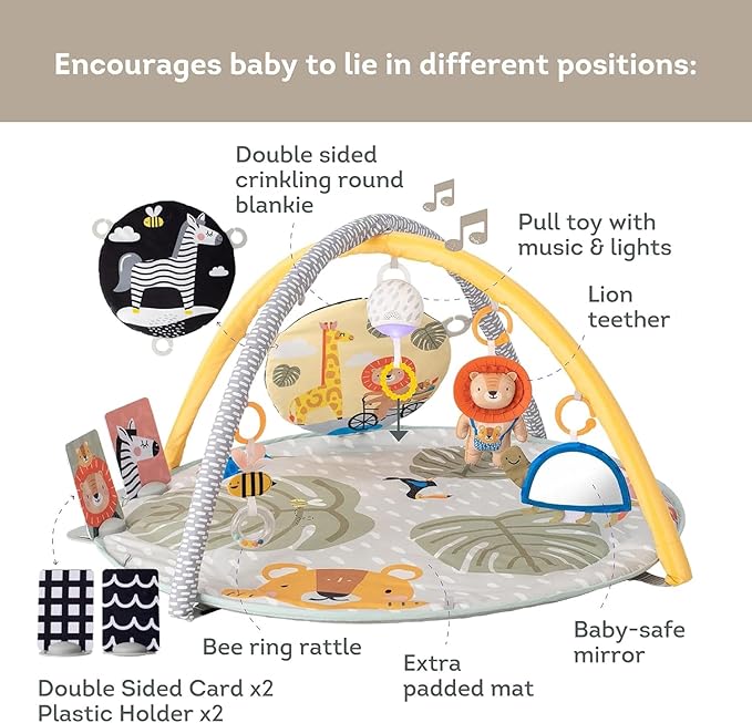 Además, incluye 7 juguetes colgantes multisensoriales, un juguete musical con luces y melodías y accesorios diseñados para fomentar el aprendizaje a través del juego.