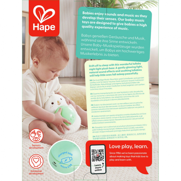 Acompaña las noches de tu bebé con este oso de peluche con luz de cuna, creado para ofrecer tranquilidad, confort y conexión emocional desde el nacimiento. Su luz suave, los efectos de sonido naturales y las canciones de cuna relajantes crean un ambiente perfecto para dormir plácidamente.