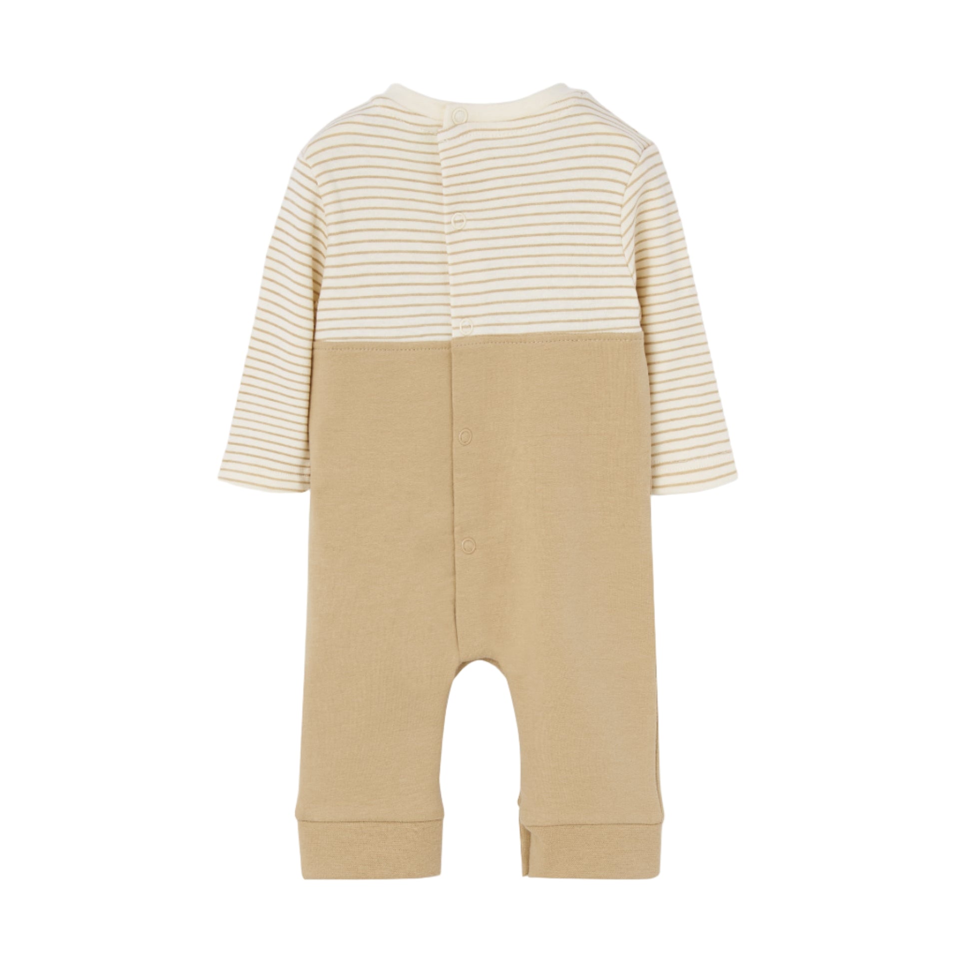 Overol color ivory con detalle de bolsillos. El overol cuenta con dos botones en la parte delantera y botones de cierre a presión en la entrepierna.