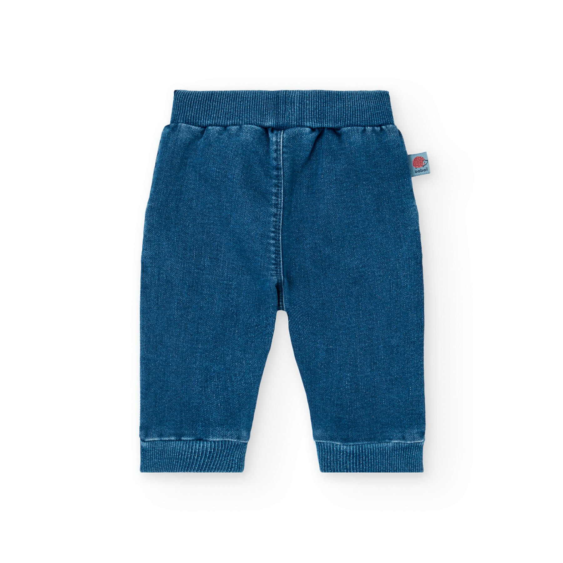 Pantalón para bebé en un color denim. Es de felpa tejana elástica fina en color azul claro, junto con un sutil detalle de puerco espin en el lateral, perfecto para combinar con Sweater Tejido Boboli Erizo Mostaza, Lleva etiqueta de la marca y se ajusta con goma elástica.