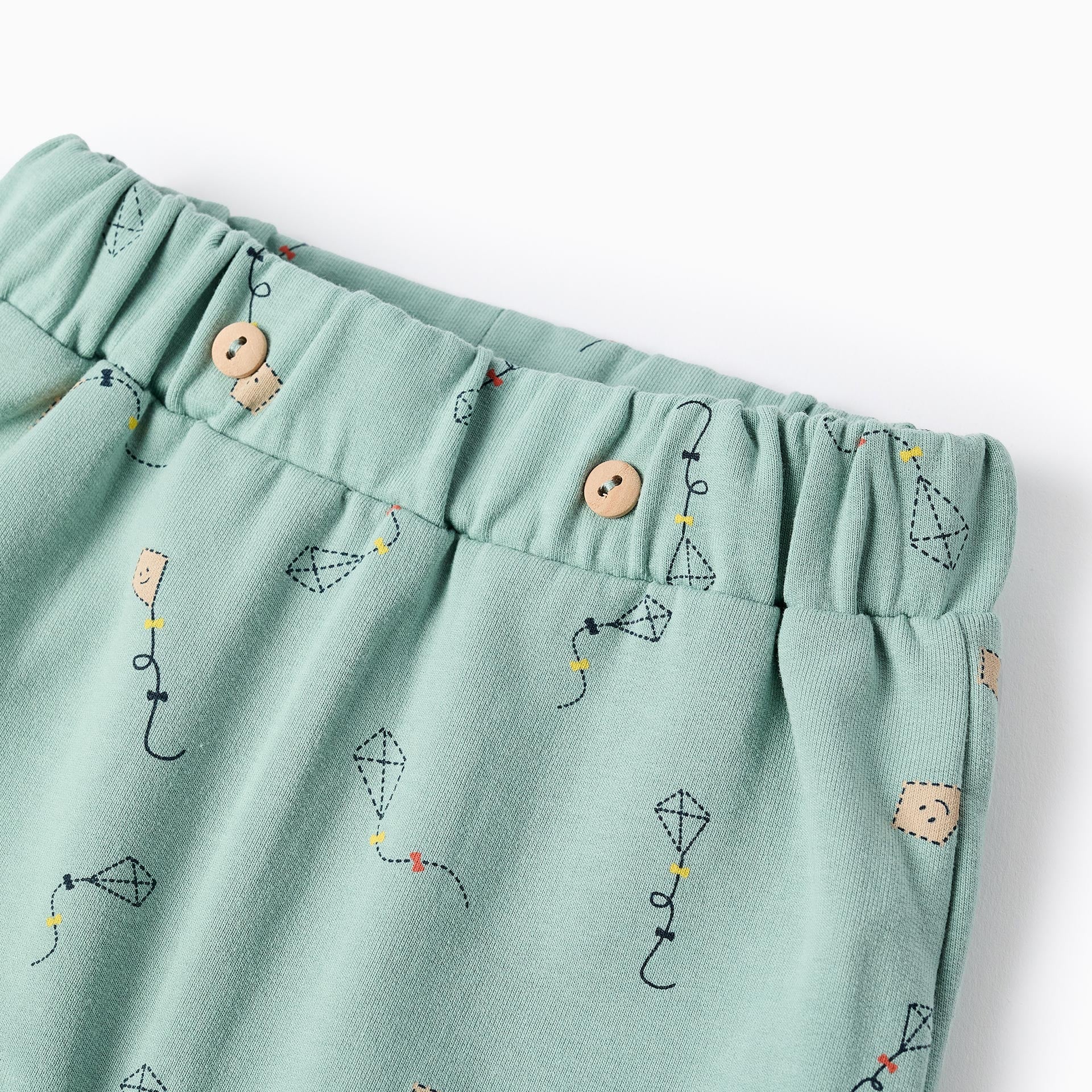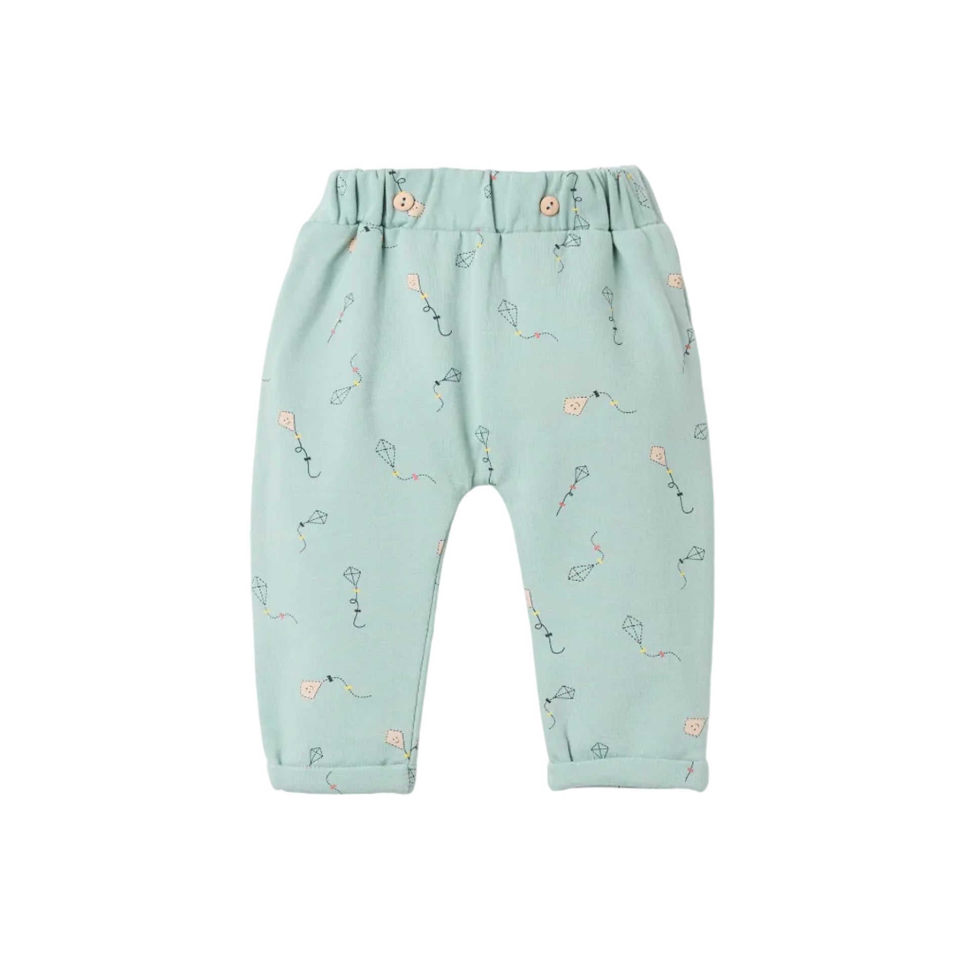 Pantalón en algodón, de color verde claro con detalles de cometas La cintura es de cánale al igual que los extremos. Un pantalón muy cómodo para tu bebé.