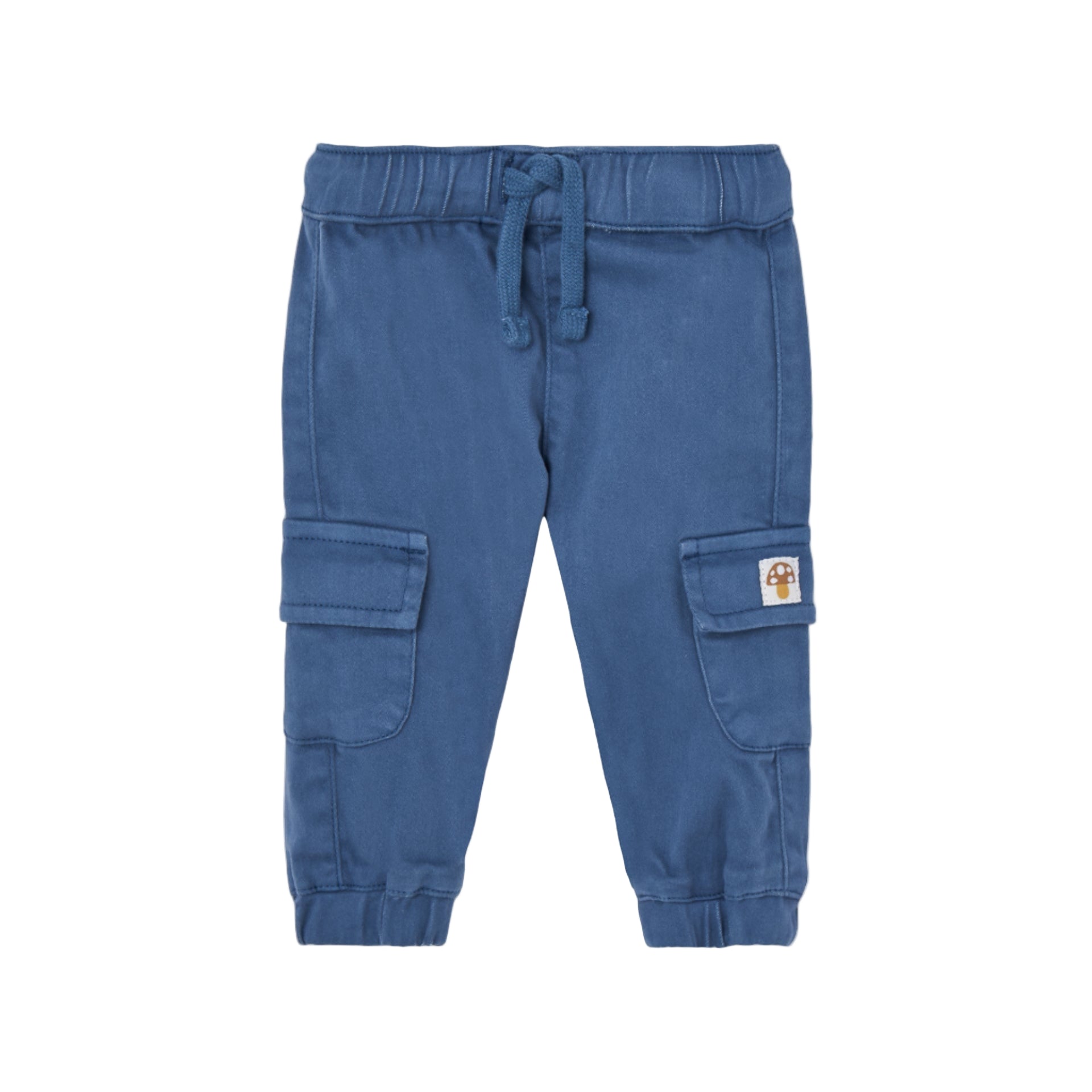 Pantalón en denim color azul para niño. Cintura elástica con trabillas. Bragueta simulada con cierre de botón a presión. Con bolsillos laterales y caucho para ajuste en la cintura.