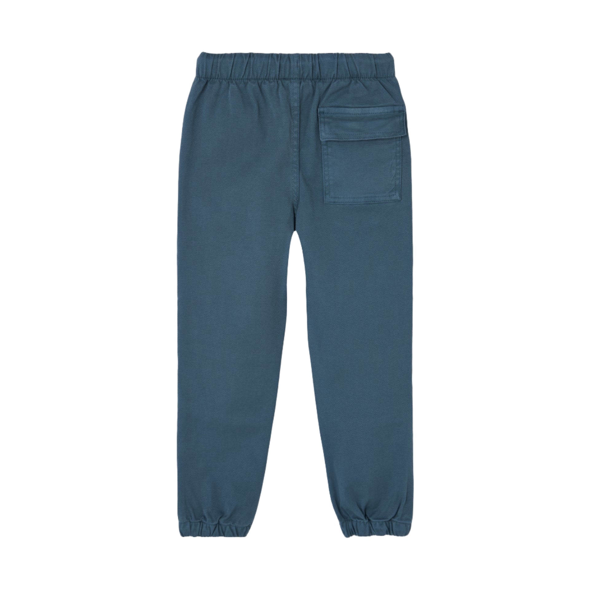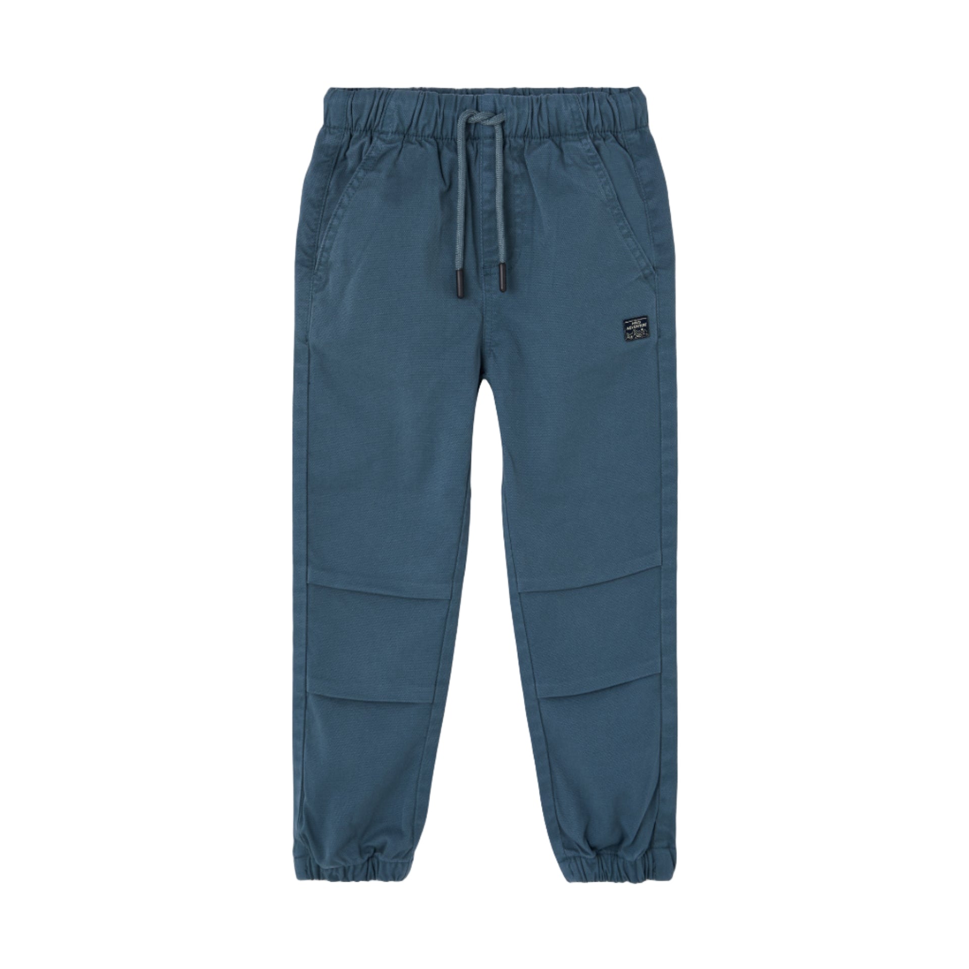 Pantalón de color azul con elástico para niño, personalizado de marca Losan. Trabillas en la cintura y ajustador interior de goma con cordón. Bolsillo trasero con estilo , ideal para salidas casuales o día a día perfecto para las pequeñas aventuras.