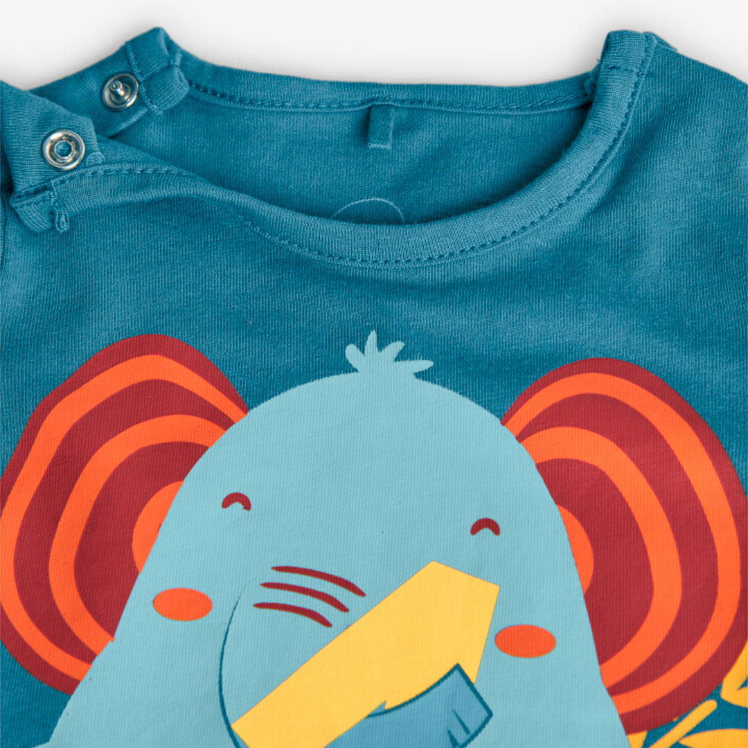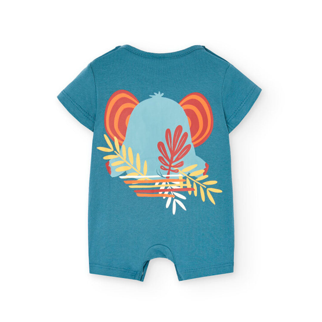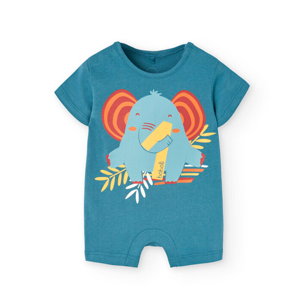 Este es un pelele corto de punto para bebé, ideal para los meses más cálidos. Su color verde vibrante lo hace atractivo y alegre. El diseño incluye un simpático elefante que añade un toque divertido. Fabricado en un tejido suave y transpirable, proporciona comodidad y libertad de movimiento.