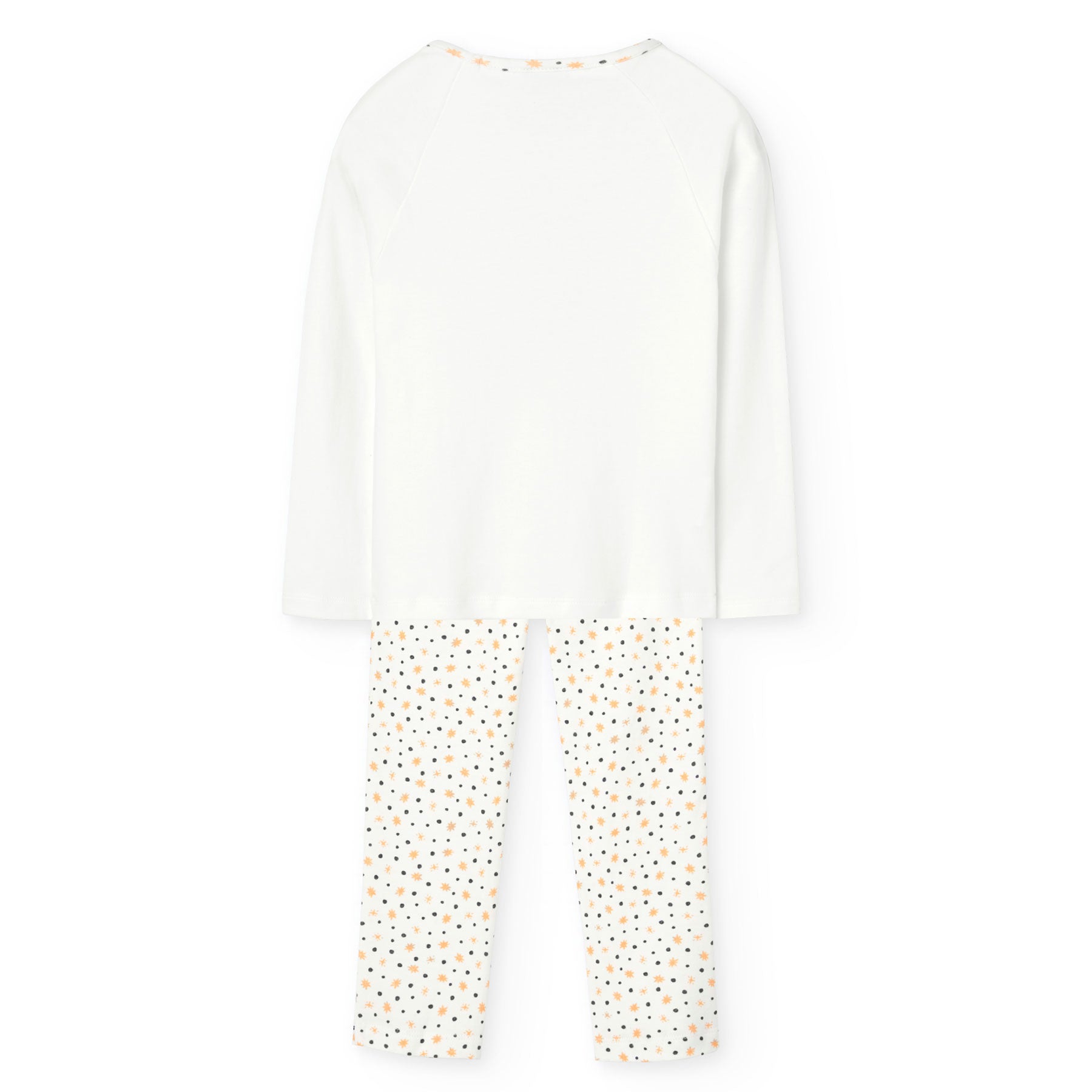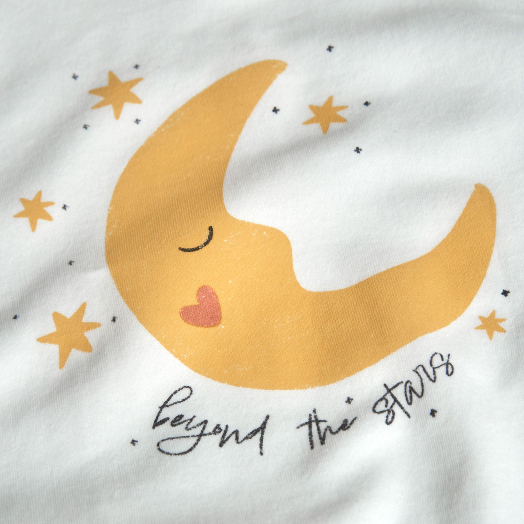 El conjunto incluye una camiseta blanca con detalles dorados y la frase "beyond the stars", que complementa los pantalones adornados con pequeñas estrellas.