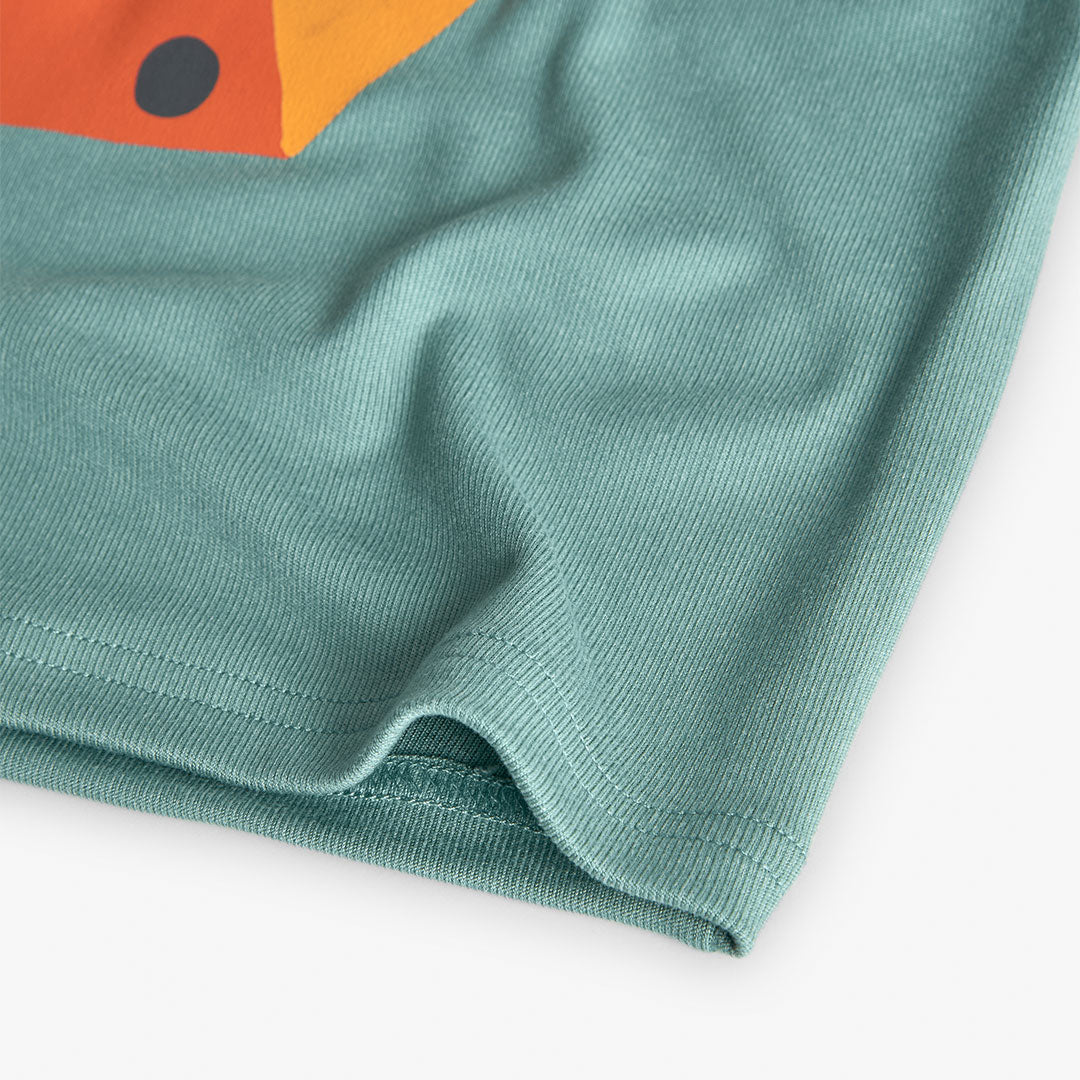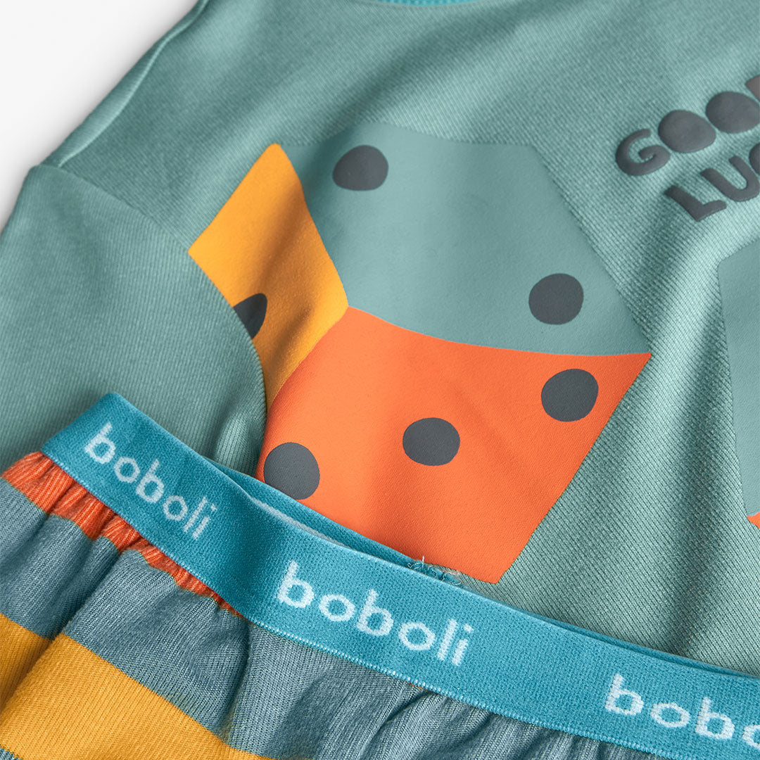 Pijama de punto para niño, ideal para la temporada de otoño-invierno, confeccionado en tejido suave para asegurar comodidad. Conjunto que presenta un diseño lúdico con un estampado de dados en la parte superior, mientras que los pantalones cuentan con rayas en tonos verde, naranja y amarillo, ofreciendo un vibrante colorido. Con mangas largas, es perfecto para mantener el calor en noches frescas.