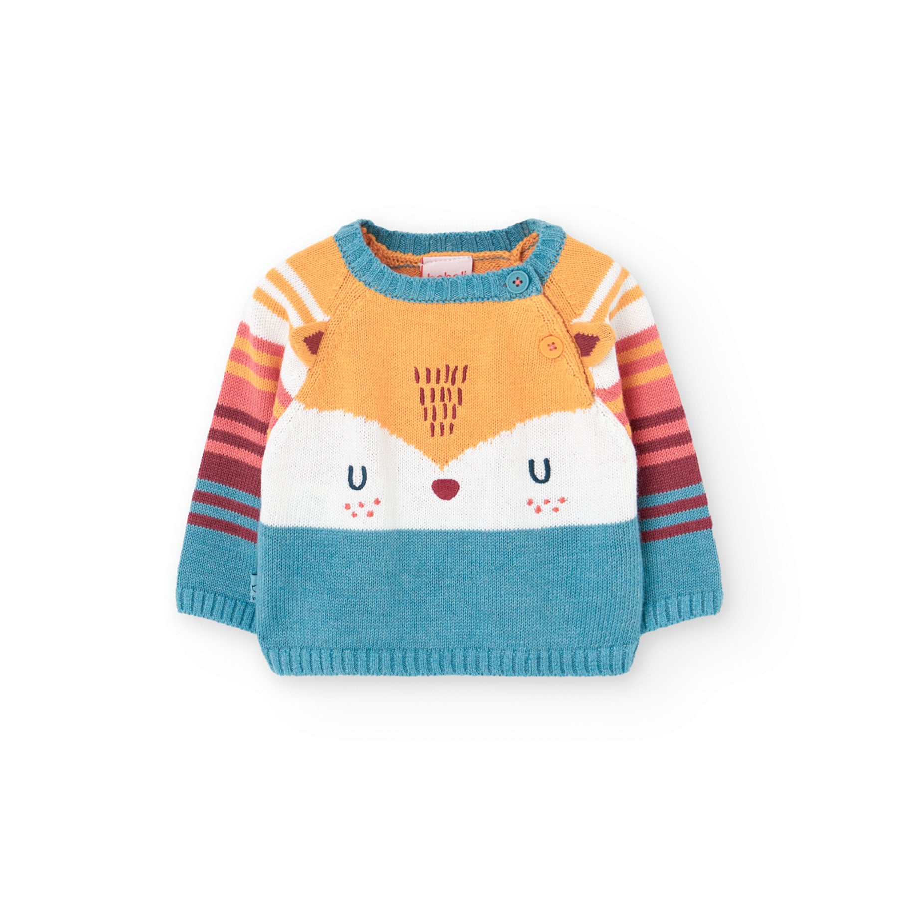 Este es un sweater tejido para bebé unisex, ideal para el invierno. Su tejido de punto es suave y cómodo, perfecto para mantener a tu pequeño abrigado. El diseño presenta una decoración de perrito zorro, añadiendo un toque divertido a la prenda por las lindas divisiones de color, empezando en el frente y terminando en la espalda. El cuello redondo con botones laterales hace que sea fácil de poner y quitar. su paleta de colores hace que combine fácilmente con otras prendas. Este sweater es una opción práctica y con mucho estilo para los outfits de tu niño.