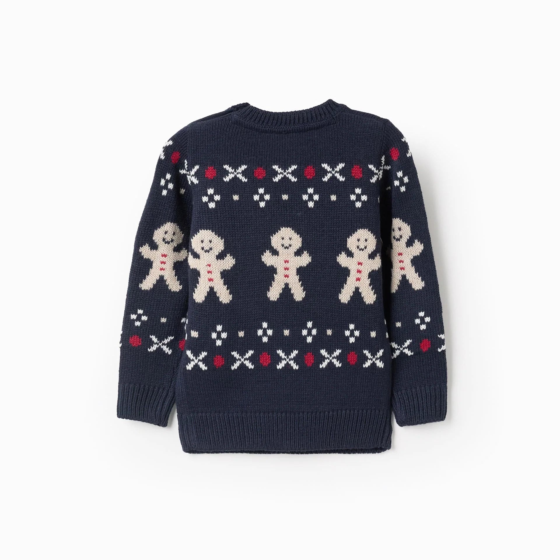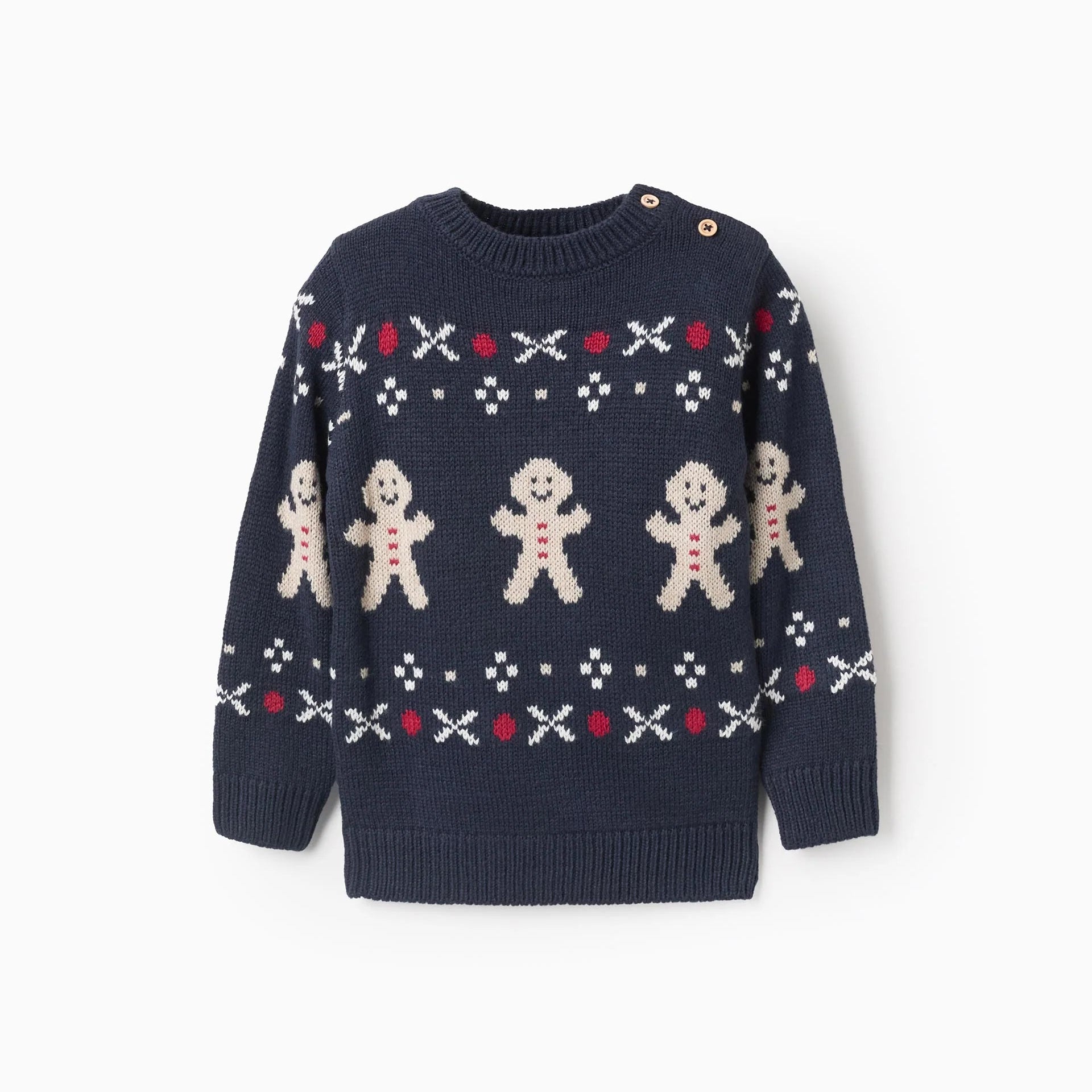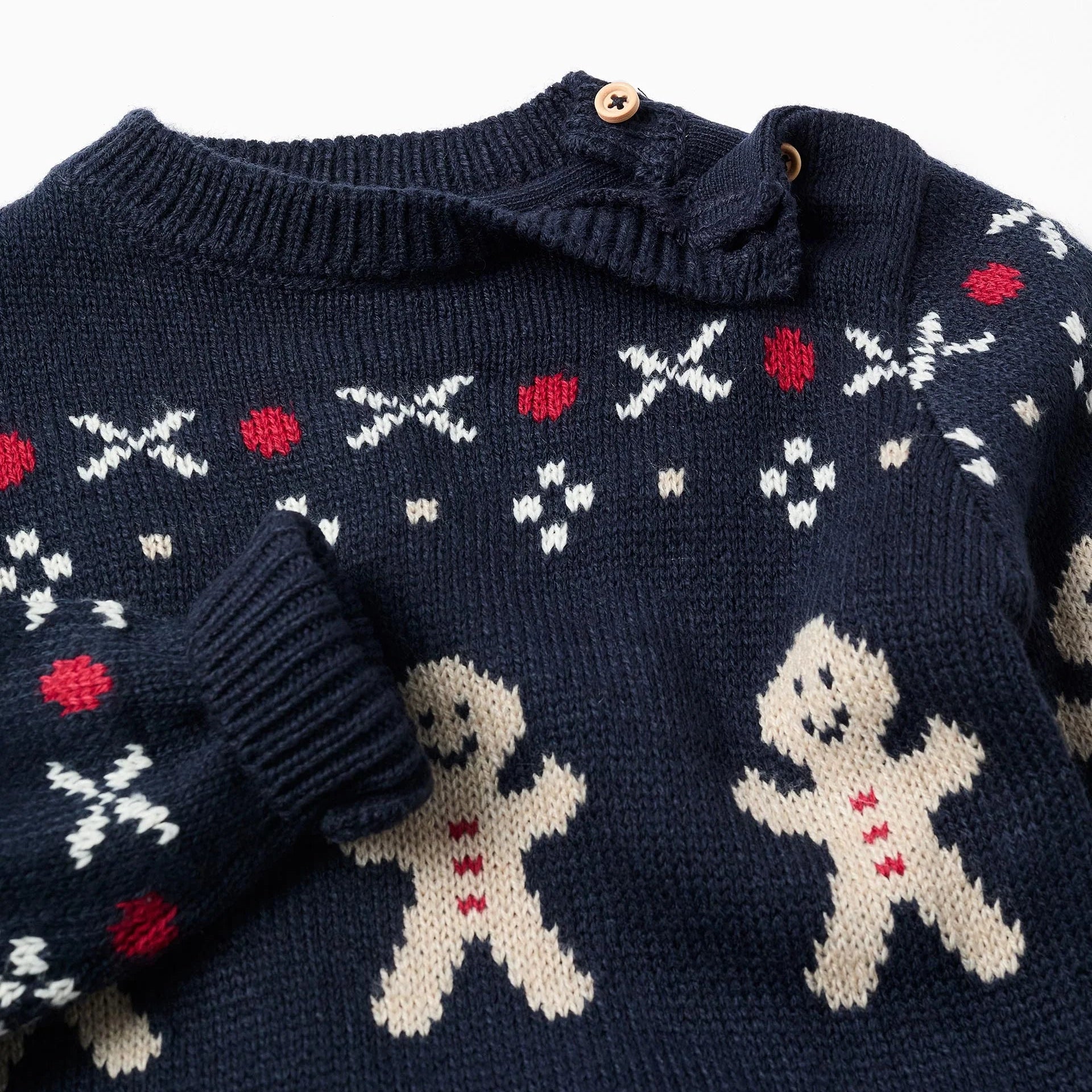 Jersey de punto azul oscuro para bebé niño, con un jacquard navideño de galletas en forma de "hombre de jengibre".